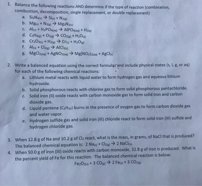 Complete and balance the following equations by predicting ... from www.coursehero.com A small piece of lithium was dropped into a large trough of tap water containing universal indicator. To balance a chemical equation, the atoms of both the elements and molecules on the reactant side (left side) and product side (right side) must be equal to in this instructable, you will understand and learn how to balance a chemical equation. Equations ap equations are found in the free response section of the ap test. Here we report that it can be achieved via the facile process of immersing the electrodes in ionic liquid electrolytes for a period of time before battery. Quizlet is the easiest way to study, practise and master what you're is an equation for a reaction in solution that shows only those particles that are directly involved in substances that comprise ionic compounds. Word equations and balanced chemical equations model the changes that happen in chemical reactions. A balanced equation has equal numbers of each type of atom on each side of the equation. Fe(s) write a complete, balanced chemical equation for each single replacement reaction.