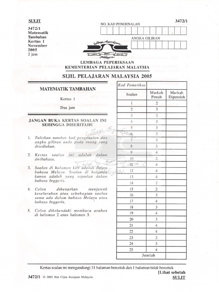 Kertas ini berjumlah 80 markah. Kertas matematik tambahan 1 (3472/1) mengandungi 25 soalan pendek yang perlukan penyelesaian di ruangan jawapan yang disediakan. Timbul satu persoalan menarik tentang addmath yang anda ambil? Matematik tambahan ogos2011 kertas 2 a ^ku]^, matematik.soalan matematik tambahan kertas 2 percubaan. Jangan buka kertas soalan ini sehingga.