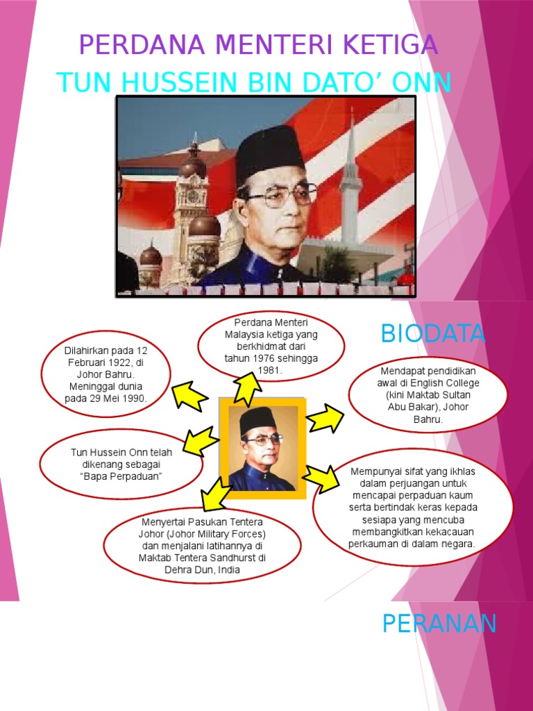 Tun hussein bin dato' onn, smn, dk was the third prime minister of malaysia, serving in this role from 1976 to 1981. Beliau meninggal dunia pada 29 mei 1990 pada usia 68 tahun.tun hussein onn kini dikenang sebagai bapa perpaduan bagi mengenangkan segala jasa danusahanya dalam. He was born in johor bahru, johor on february 12, 1922 to dato onn jaafar and. Beliau mendapat didikan awal di singapura dan pelajaran menengahnya di english college, johor bahru. Tun hussein onn, merupakan perdana menteri malaysia yang ke tiga, memimpin negara dari tahun 1976 hingga 1981. Perdana menteri malaysia ketiga meletakkan perpaduan kaum sebagai elemen utama dalam pentadbiran beliau. Johor bahru, british malaya agama: Walaupun pada masa beliau memegang pucuk pimpinan negara anasir subversif dan kegiatan penganas komunis telah kian. Tun hussein onn lahir daripada keluarga berlatarbelakangkan politik kerana ayah, datuk dan bapa saudaranya pernah menjadi menteri besar johor. Tun hussein onn background and early life: Suhaila tan seri mohammad noah. Bicara profesor ulung bertajuk kefahaman baru tentang perpaduan & peranan universiti dalam perpaduan nasional. 12 february 1922 working :